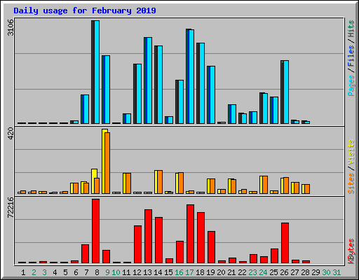 | Day | Hits | Files | Pages | Visits | Sites | KBytes | ||||||